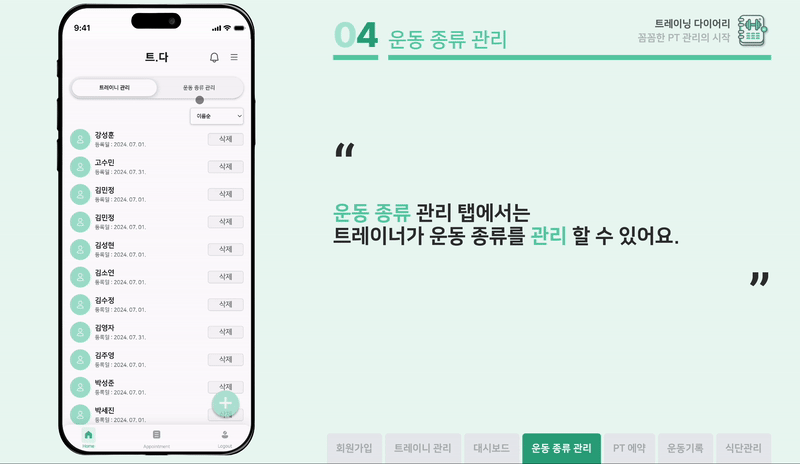 트레이너는 자신이 생성한 운동 종류의 목록을 확인할 수 있습니다.