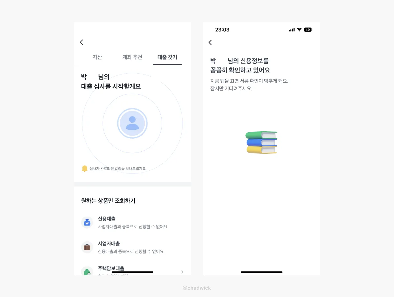 토스의 경우, 딜레이가 거의 없는 편이지만, 계좌 정보 불러오기나, 대출 심사 등 외부 정보를 호출하는 구간에서는 귀엽고 톡톡 튀는 애니메이션을 제공한다.
