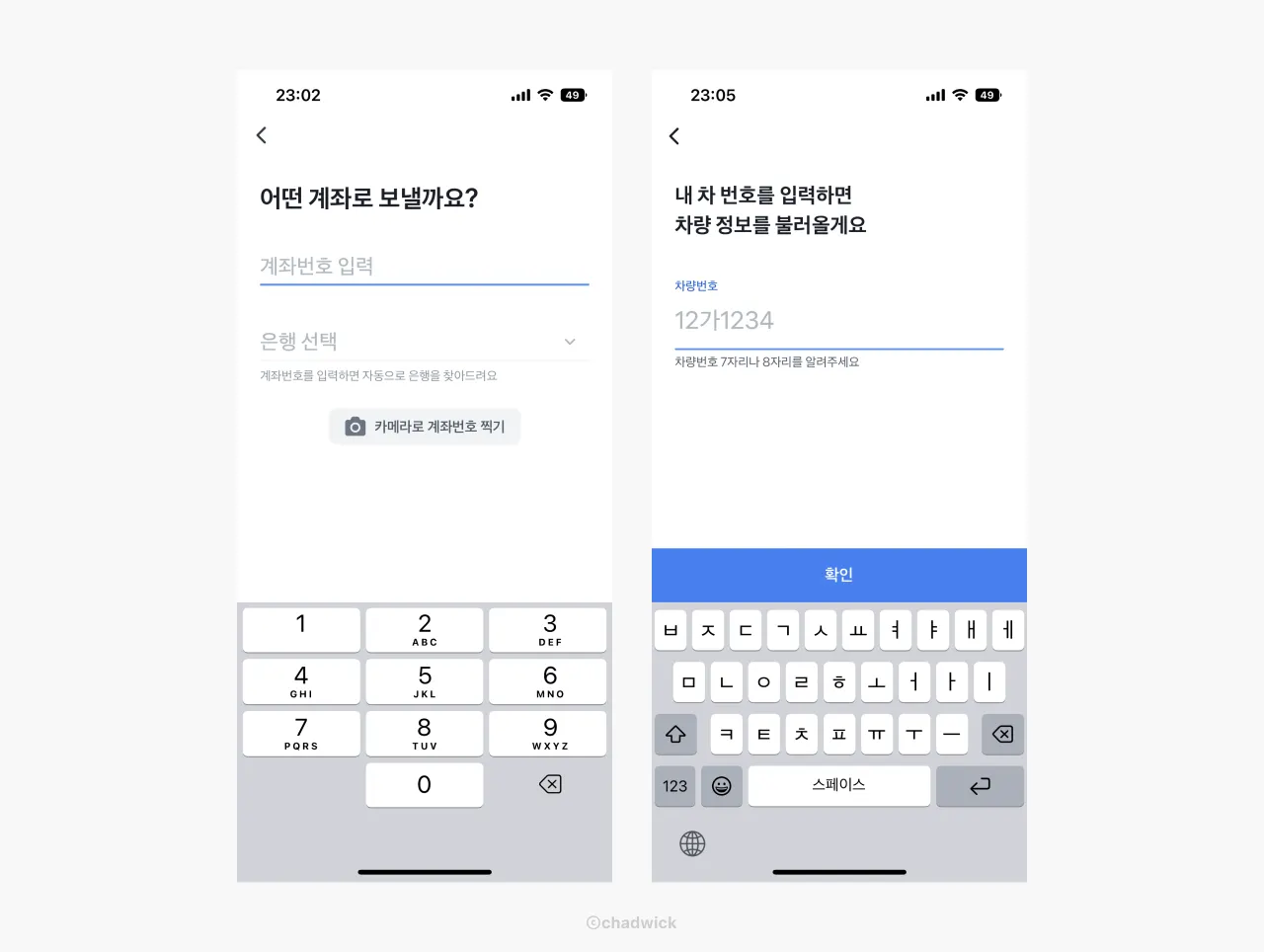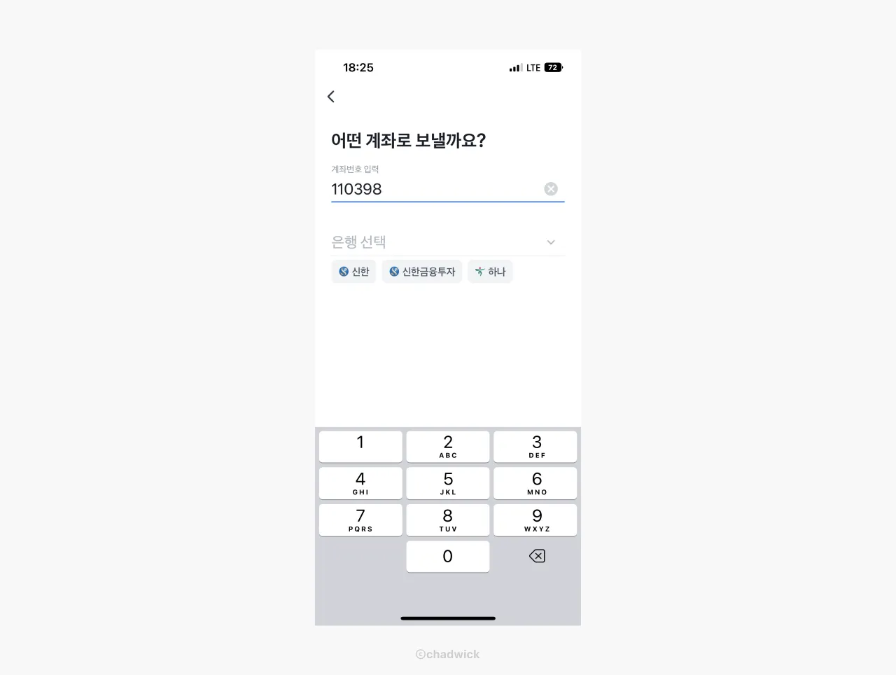 토스는 사용자가 계좌번호를 입력하면 해당 계좌번호에서 은행별 계좌번호 고유의 패턴을 파악해서 은행 선택 드롭다운 아래에 추천 은행명 버튼을 표시해준다. 이를 클릭하면 드롭다운으로 일일이 찾지 않아도 즉시 해당 은행을 선택할 수 있다.