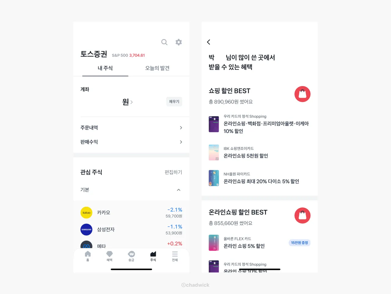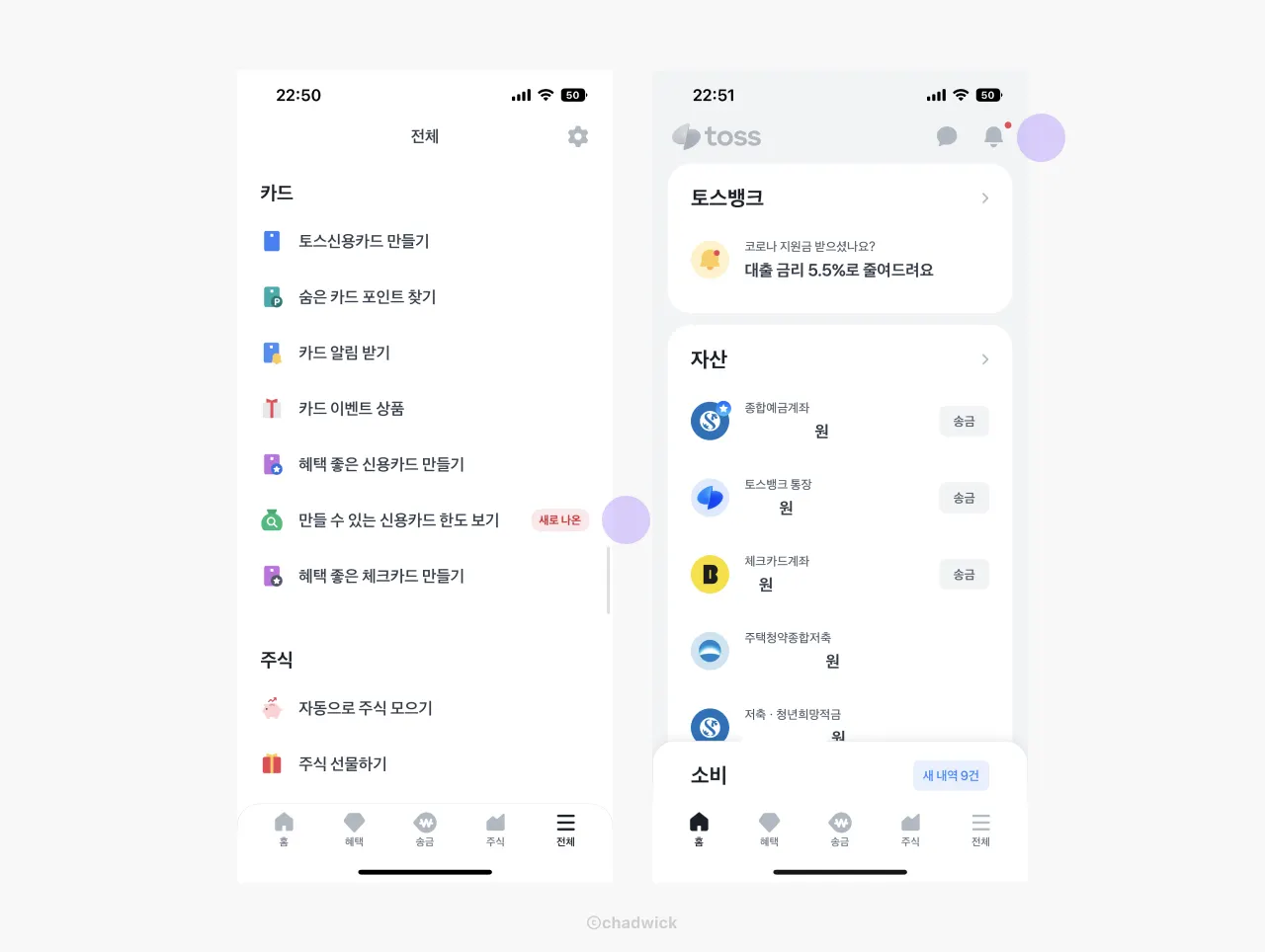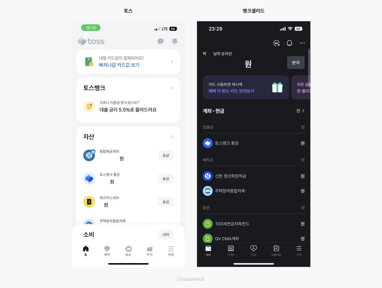 토스의 메인 화면은 여타 다른 금융앱과 크게 다르지 않은 디자인을 보여준다. 우측 뱅크샐러드와 비교해보면, 전체 자산 화면의 UI가 크게 차이나지 않는다는 것을 확인할 수 있다. 이때까지 다양한 금융앱, 마이데이터 앱을 써온 사용자가 토스를 처음 사용하게 되더라도 이질감이 느껴지지 않는 이유가 이미 우리에게 익숙한 인터페이스와 사용성을 제공하기 때문이다.