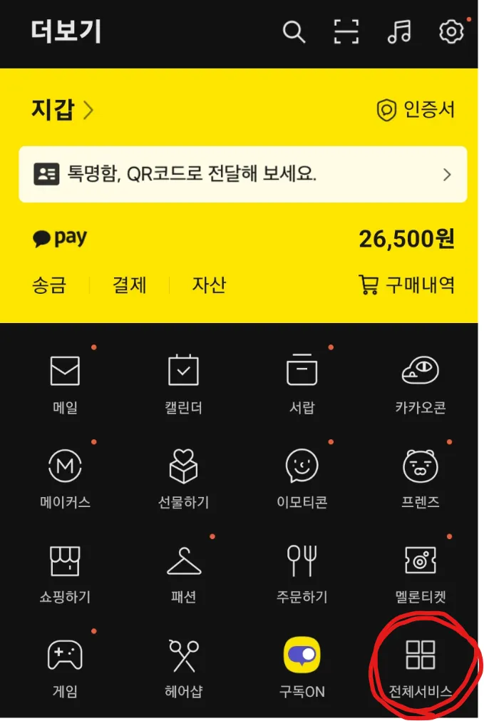 ‘더보기’탭에서 ‘전체서비스’ 아이콘을 찾은 후, 하단으로 스크롤 하여 카카오뱅크를 터치해야 함.