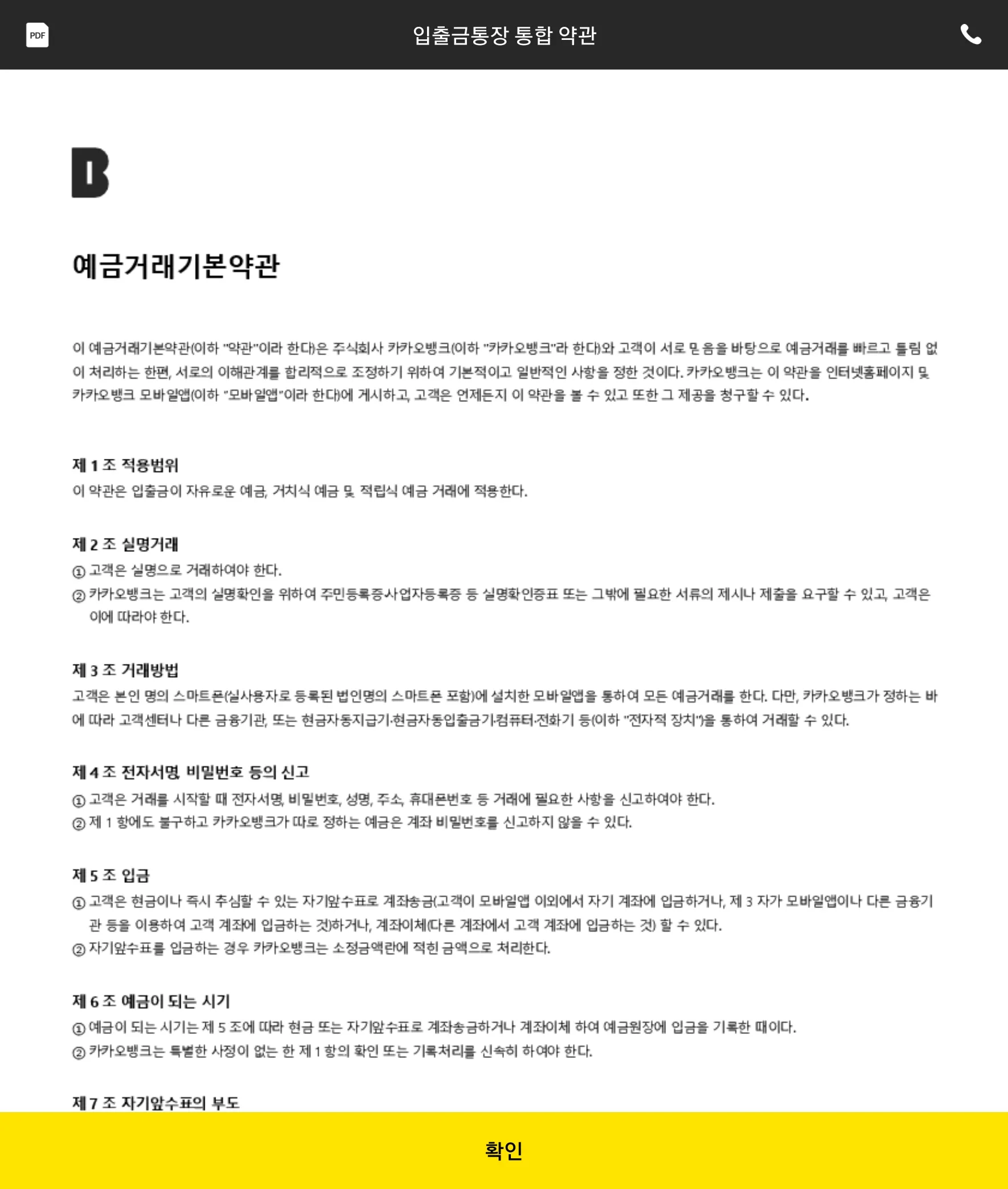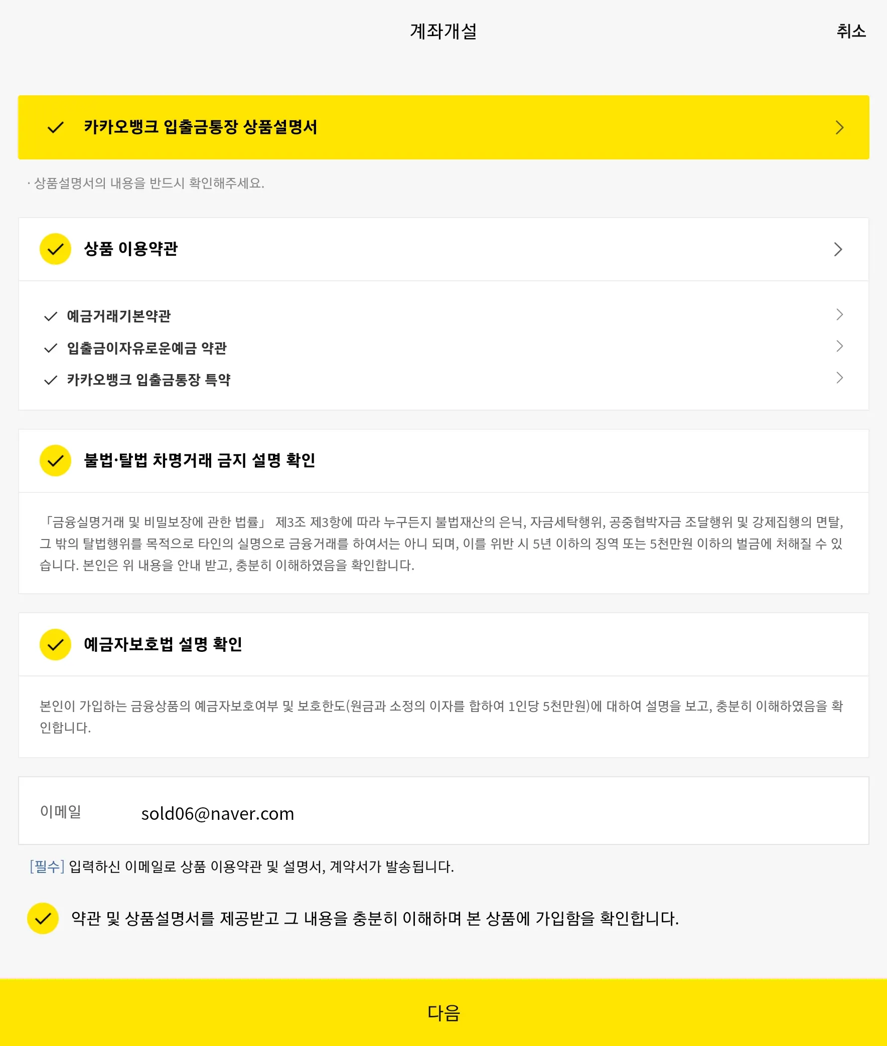 모든 체크박스에 체크가 되면 ‘다음’버튼을 이용할 수 있게 되며, 카카오 노란색으로 하이라이트 처리