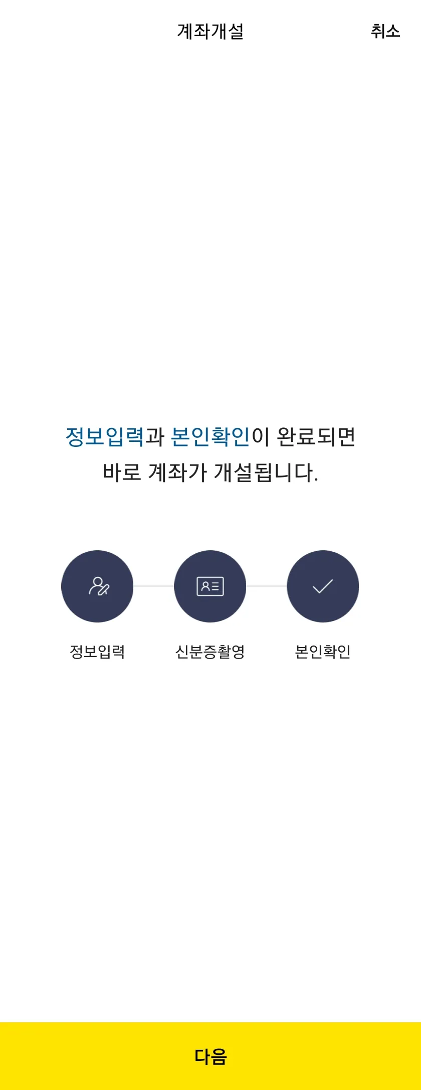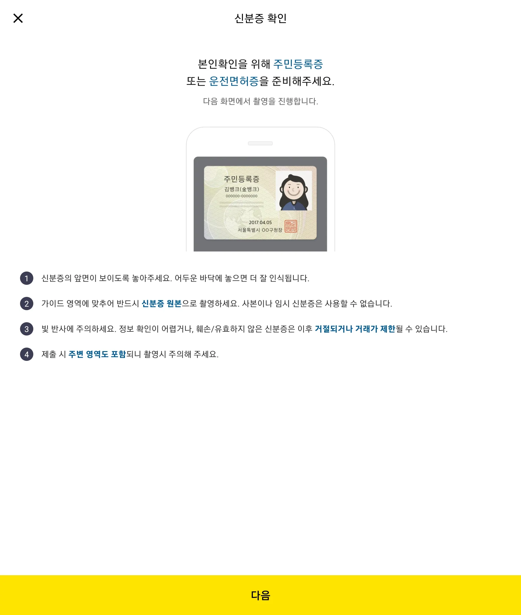처음에는 무의식적으로 다음버튼을 눌러 넘어가게 됐는데, 다시 살펴보니 ‘신분증촬영’과 ‘본인확인’ 단계가 있음을 볼 수 있었음