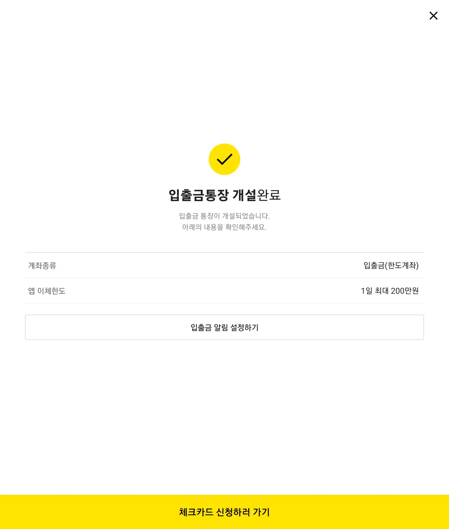 계좌개설이 완료되면, 체크카드 발급 단계로 바로 이어준다. 원하지 않는 경우, X버튼이나 이전 버튼으로 얼마든지 나올 수 있다.