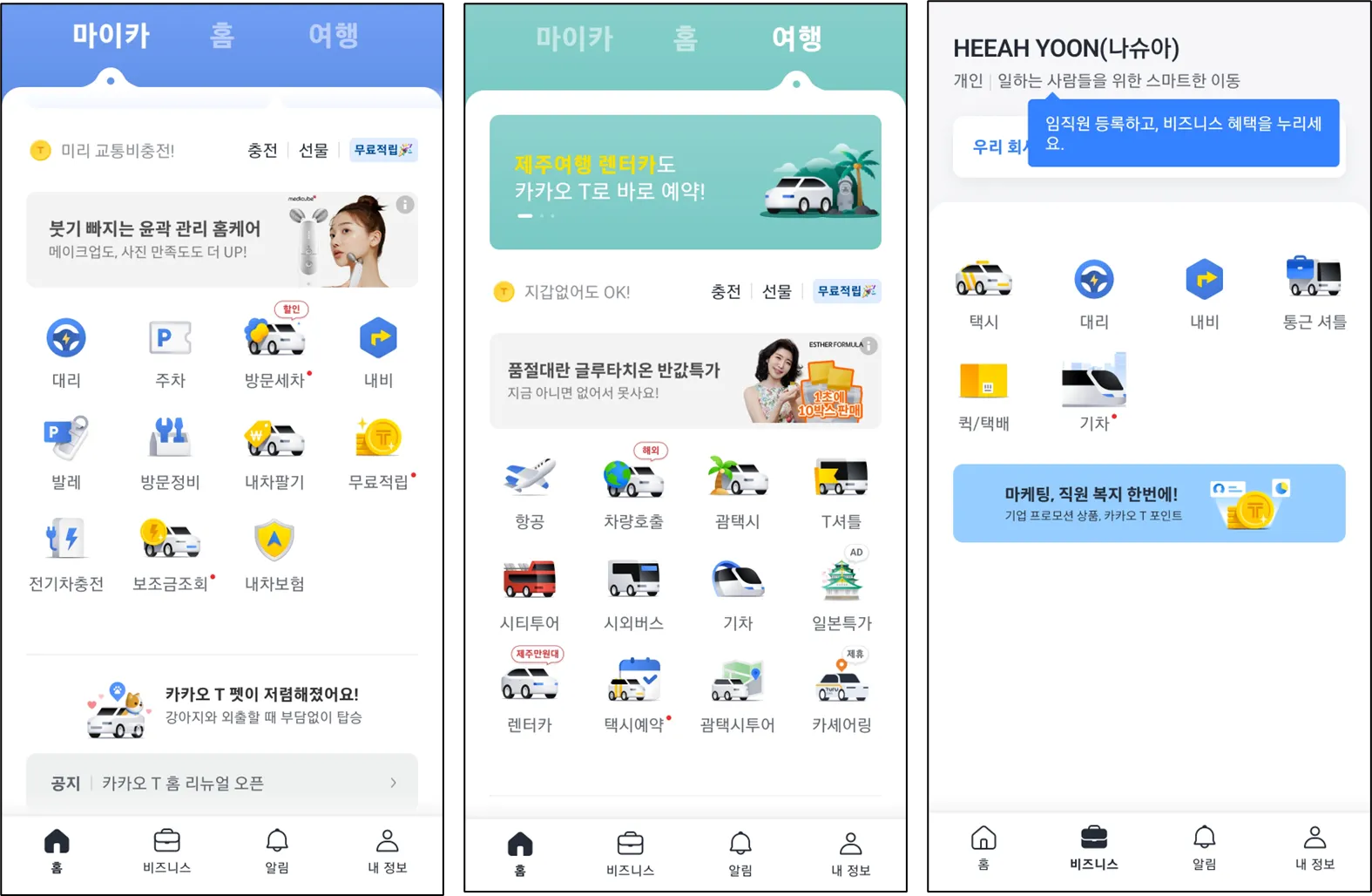 μ βλΉμ¦λμ€β νλͺ©μ ν΄λ¦νλ©΄ λΉμ¦λμ€μ μΌλ‘ μΉ΄μΉ΄μ€Tλ₯Ό μ΄μ©νλ μ΄μ©μλ₯Ό μν νμ΄μ§ λ³λ ꡬμ±