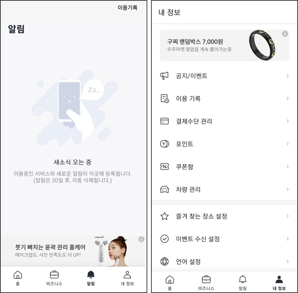 μ ν, λΉμ¦λμ€, μλ¦Ό, λ΄ μ λ³΄λ‘ κ΅¬μ±λμμΌλ©° βλ΄ μ 보βλ₯Ό ν΄λ¦νλ©΄ λ±κΈκ³Ό λμ λ°°μ§ κ·Έλ¦¬κ³ κ³΅μ§/μ΄λ²€νΈ, μ΄μ© κΈ°λ‘, κ²°μ μλ¨ κ΄λ¦¬, ν¬μΈνΈ, μΏ ν°ν¨, μ°¨λ κ΄λ¦¬ λ±μ νμΈ λ° κ΄λ¦¬ν μ μμ.