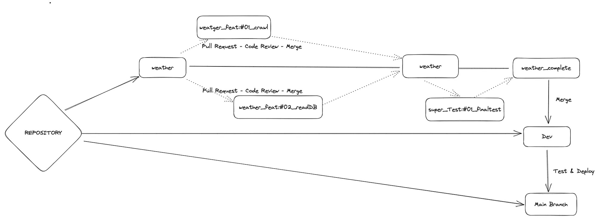 2) dev : 개발을 위한 브랜치 (모든 개발내용은 해당 브랜치위에서 feat단위로 서브 브랜치 생성/commit 후 해당 브랜치로 Merge 합니다)