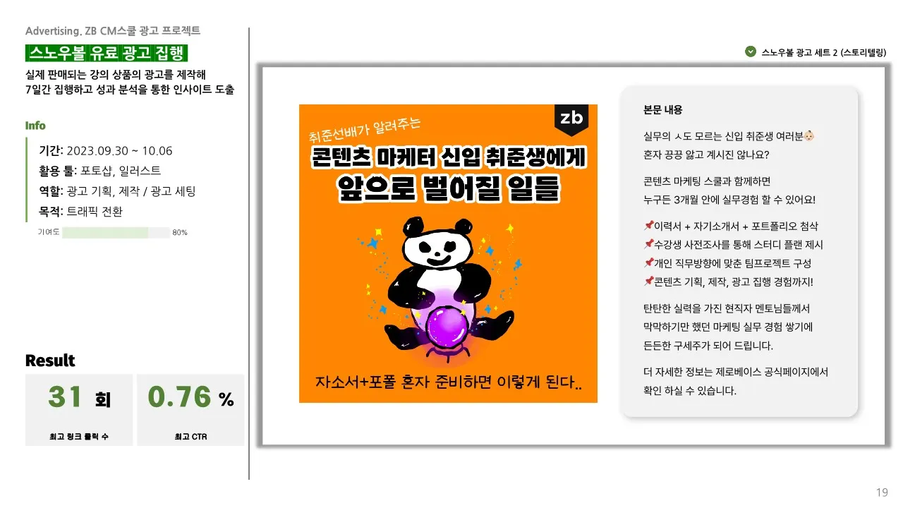 안정적인 직업이라는 장점만 바라보고 2년 간 공무원 준비를 하였으나 불합격. 이후 하고 싶은 일을 찾아 헤매던 중 글을 쓰는 것을 좋아하고 이미지 작업을 통해 썸네일을 만드는 것에 재미를 느껴 '콘텐츠 마케터'라는 직업에 대해 알게 되었습니다.