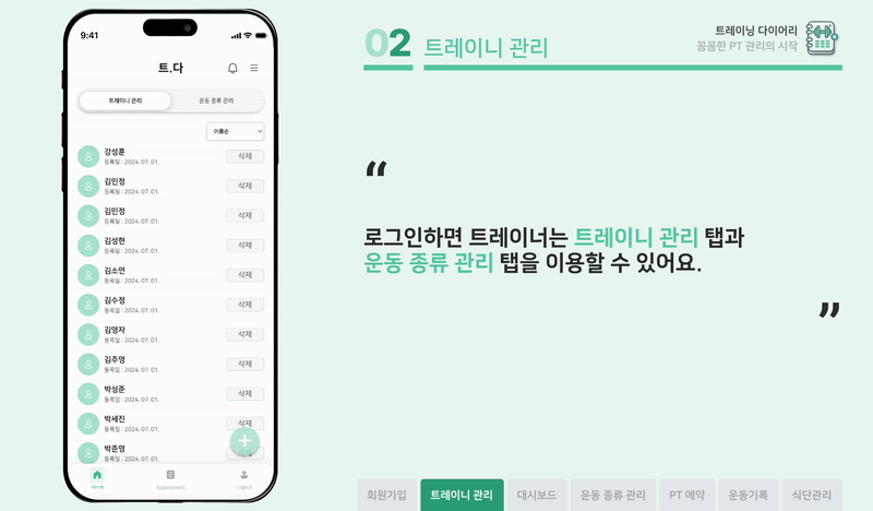 PT 수강이 시작되면 트레이너가 여기서 트레이니를 등록하고, 관리를 시작합니다.