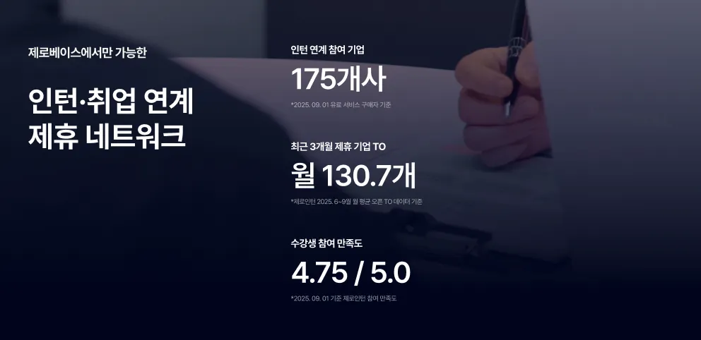 제로베이스의 또 다른 강점은 실제 기업과의 연결입니다. 우리는 175개 이상의 기업과 제휴를 맺고 있으며, 매달 평균 130건 이상의 인턴·취업 연계가 발생합니다. 이를 통해 수강생은 단순히 ‘배운다’에 머무르지 않고, 실제 채용 시장으로 나아갈 수 있는 기회를 얻습니다. 즉, 학습과 취업이 단절되지 않고 하나로 이어지는 구조를 만들어낸 것입니다.