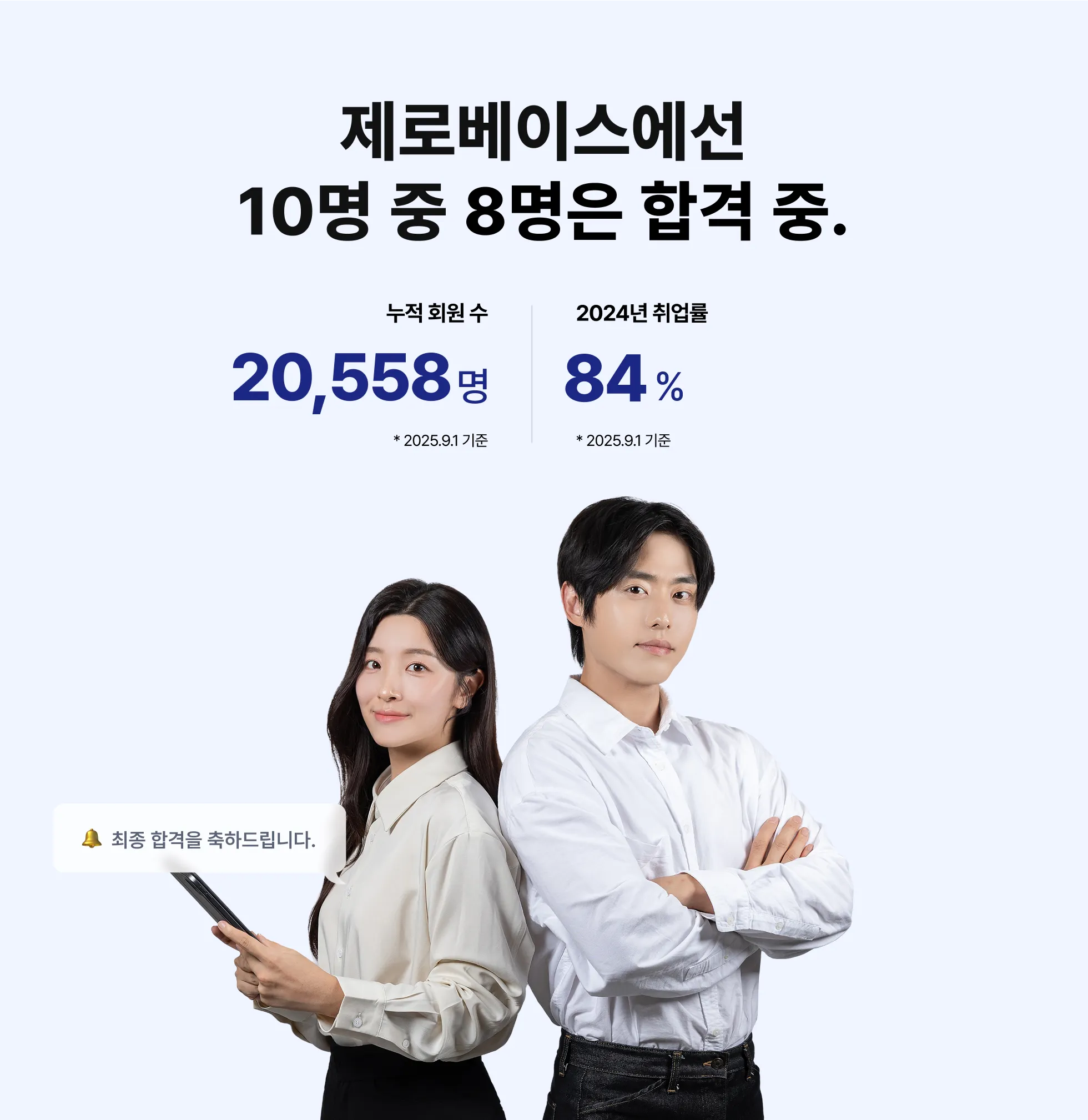 제로베이스는 단순히 강의를 제공하는 교육 기관이 아닙니다. 우리는 “취업에 성공할 수 있는 실질적 결과”를 목표로 삼는 취업 정보 회사입니다. 실제로 제로베이스는 취업률 84% 달성이라는 객관적인 수치를 기록하며, 취업 준비 시장에서 독보적인 성과를 내고 있습니다.