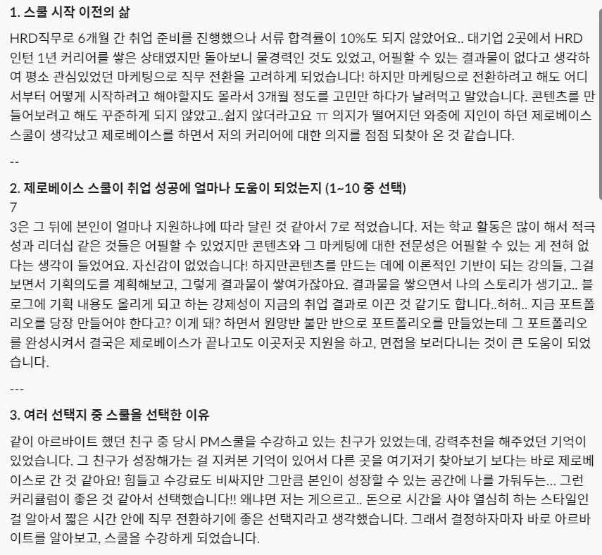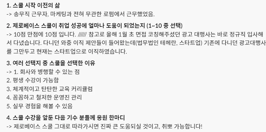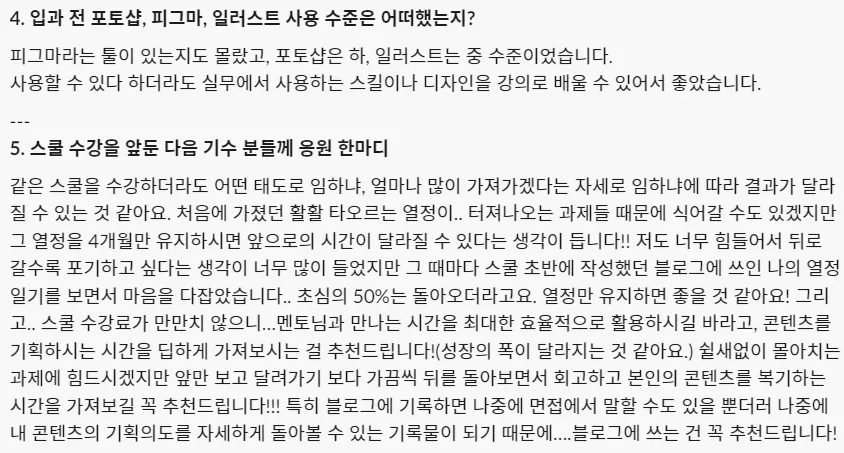 생각보다 더 치밀하고 구체적인 스쿨이에요! 커리큘럼이 자세하고 체계적이라고 생각했는데 실제로 멘토님과 매니저님의 관리까지 좋았어요!