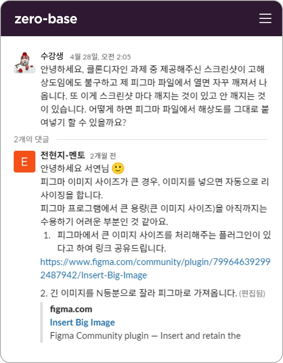 현직 디자이너 멘토님과 1:1 채팅으로 모르는 부분을 확실하게 짚고 넘어가세요!