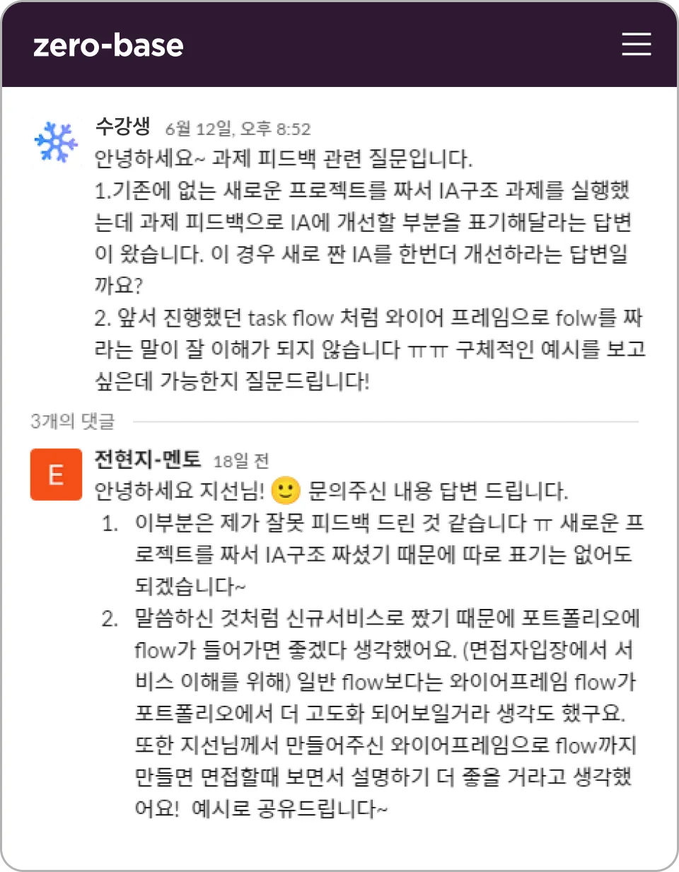 주차별 과제에 대한 멘토의 1:1 피드백은 물론, 실제 합격자들의 과제 모범 답안까지 제공합니다. 합격역량만 쏙쏙, 효율적으로 학습하세요.