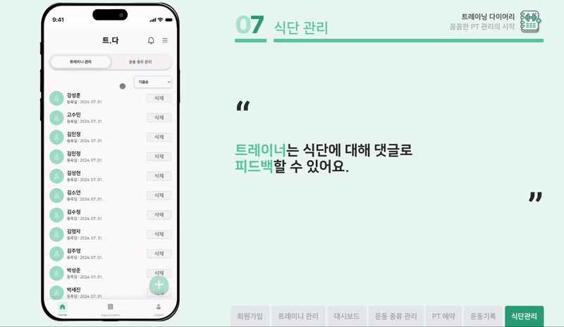 삭제 기능을 통해 트레이니는 자신의 식단 기록을 관리하고 정리할 수 있습니다.