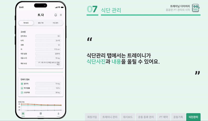 이를 통해 트레이니는 자신의 식단을 시각적으로 기록하고 관리할 수 있습니다.