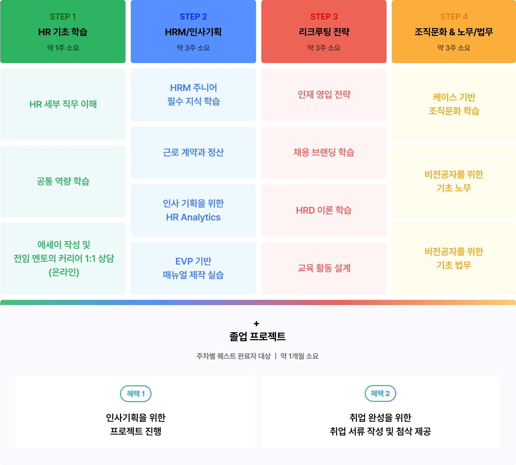 3개월 동안 HR직무 공고에 바로 지원할 수 있는 "실무 능력과 취업서류" 완성을 목표로합니다.